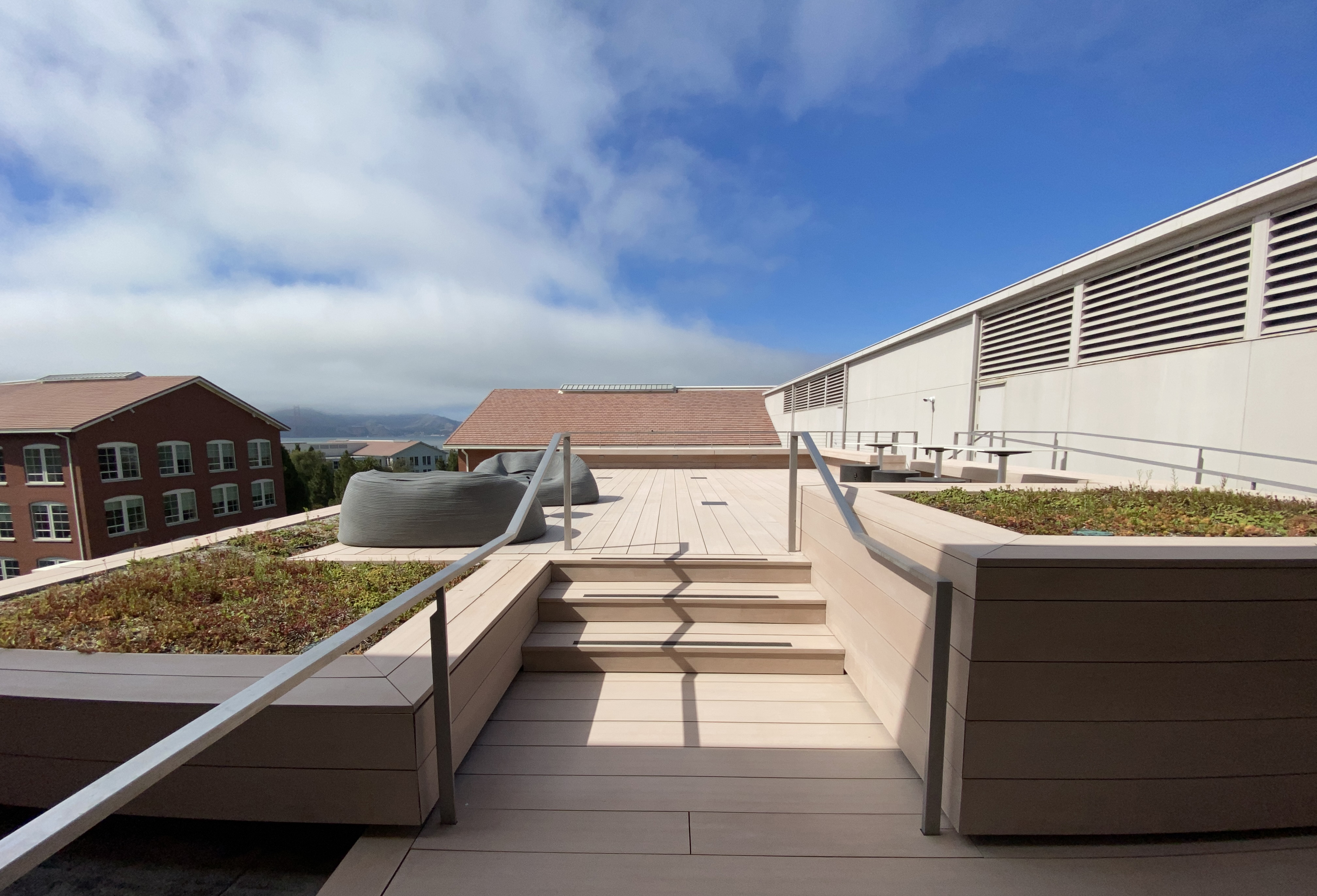 The 700 square feet roof deck offers employees an outdoor workspace views of the Golden Gate Bridge and San Francisco Bay. Heated bench seating allows for use in cooler weather. 3’-0” succulent planters along the edges allow the view to be unimpeded, without guardrails.